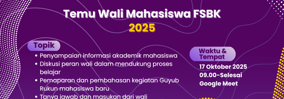 Fakultas Sastra, Budaya, dan Komunikasi (FSBK) Universitas Ahmad Dahlan (UAD) menggelar temu wali mahasiswa pada Jumat, 17 Oktober 2025. Kegiatan yang berlangsung di ruang digital melalui google meet diikuti oleh seluruh dosen, laboran FSBK dan seluruh wali mahasiswa baru angkatan 2025. Kegiatan temu wali ini bertujuan untuk meningkatkan kolaborasi kesuksesan studi mahasiswa selama berkuliah di UAD.