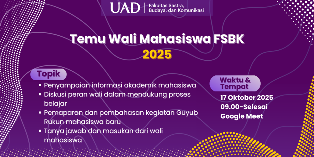 Fakultas Sastra, Budaya, dan Komunikasi (FSBK) Universitas Ahmad Dahlan (UAD) menggelar temu wali mahasiswa pada Jumat, 17 Oktober 2025. Kegiatan yang berlangsung di ruang digital melalui google meet diikuti oleh seluruh dosen, laboran FSBK dan seluruh wali mahasiswa baru angkatan 2025. Kegiatan temu wali ini bertujuan untuk meningkatkan kolaborasi kesuksesan studi mahasiswa selama berkuliah di UAD.